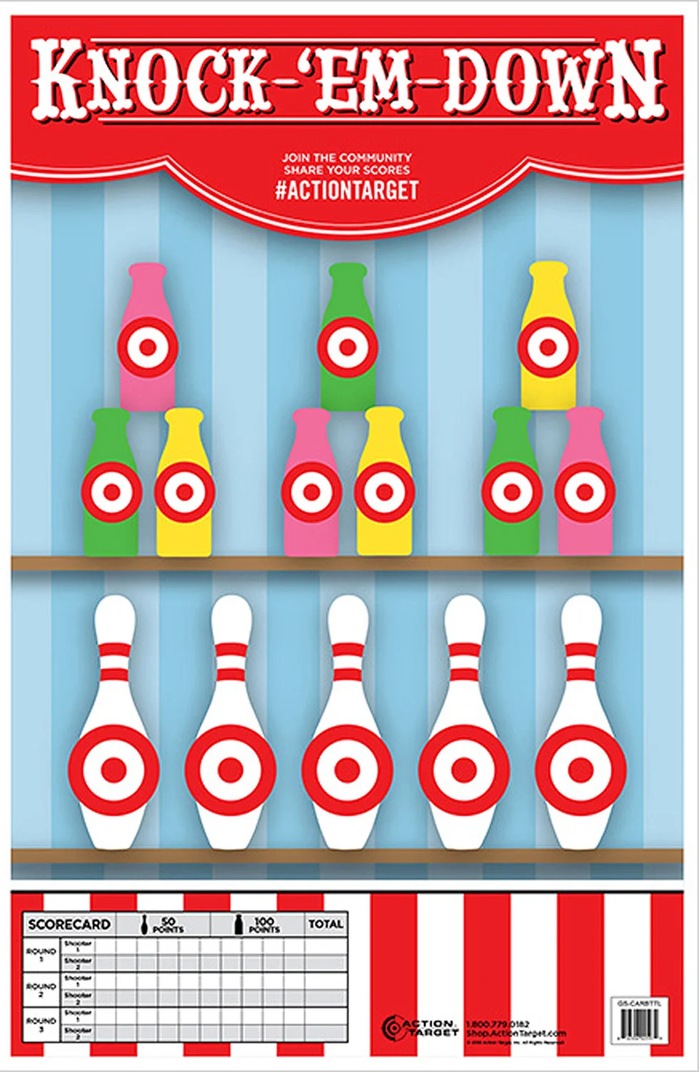 Action Target GSCARBTTL100 Entertainment Knock-‘Em-Down Bottles/Pins Paper Hanging 23″ x 35″ Multi-Color 100 Per Box