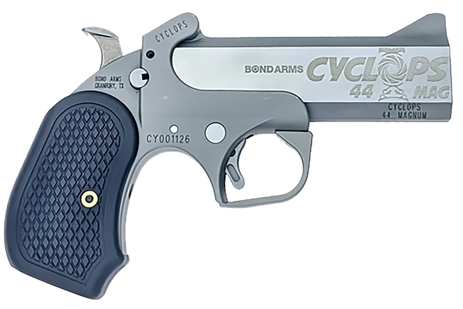 Bond Arms BACY Cyclops Big Bore 44 Mag 1rd, 4.25″ Matte Stainless Steel w/Engraved Barrel, Matte Stainless Steel Frame, Black Extended B6 Resin Grip