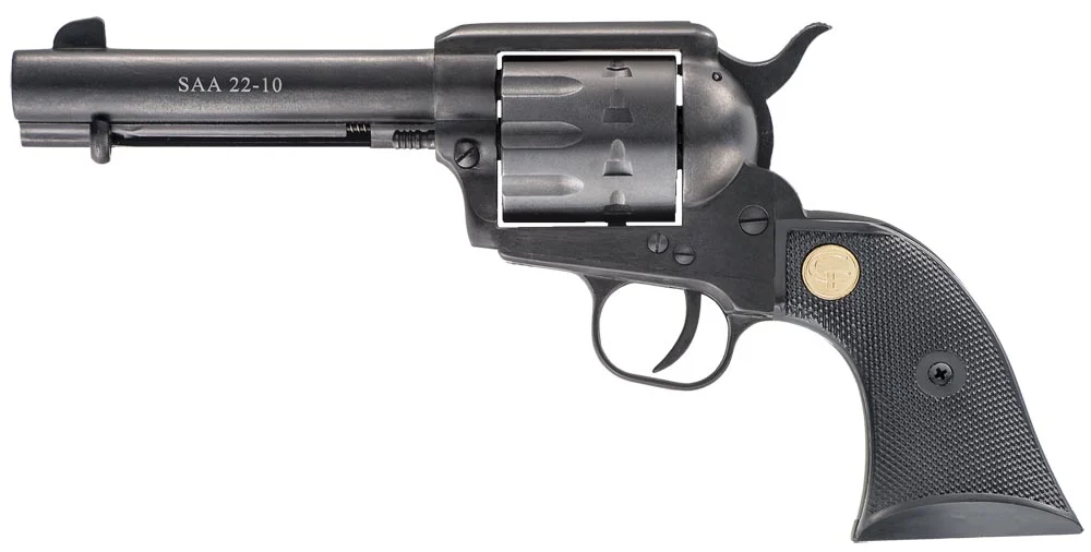 Chiappa Firearms CF340155 SAA 1873 Medium Frame 22 LR 10 Shot, 4.75″ Blued Steel Barrel, Blued Steel Frame, Blued Cylinder, Black Plastic Grip, Exposed Hammer
