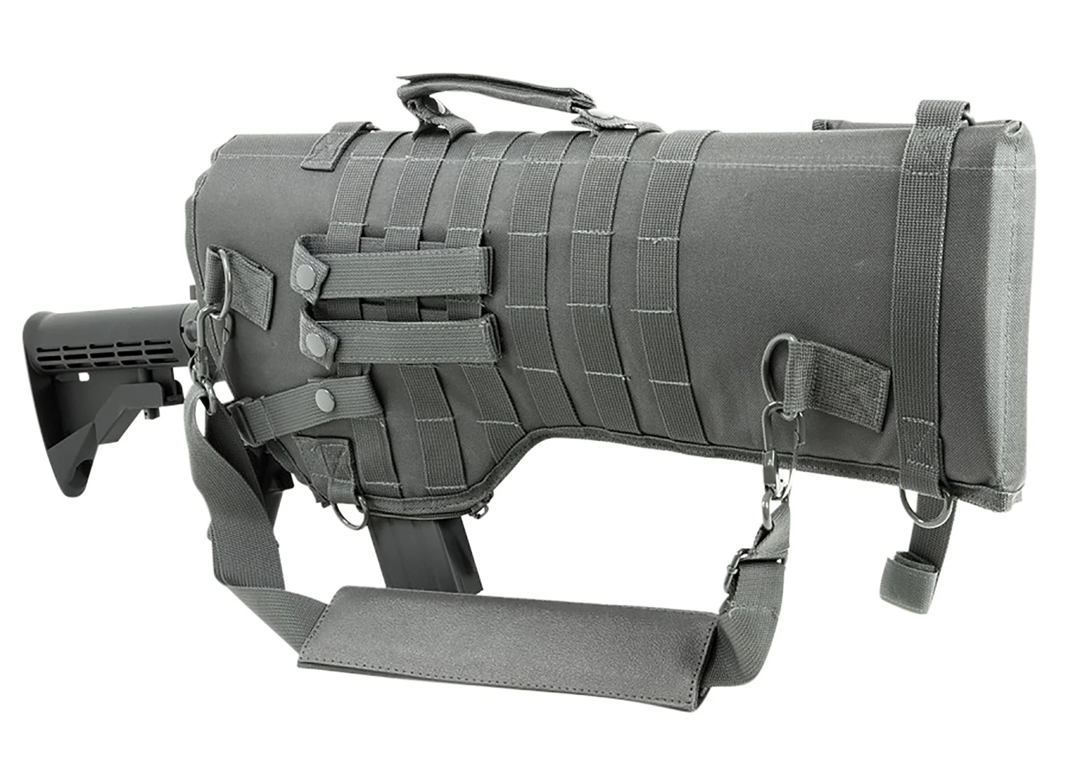 This Tactical Rifle Scabbard is designed for the an easy, comfortable, and secure way of carrying a Rifle/Carbine over the shoulder or modular mounting onto MOLLE compatible gear, with the Rifle/Carbine being readily accessible. This scabbard will fit most Rifle/Carbines with Carry Handle or Scopes/Optics attached to receiver rails. It also has a Grommet for drainage.