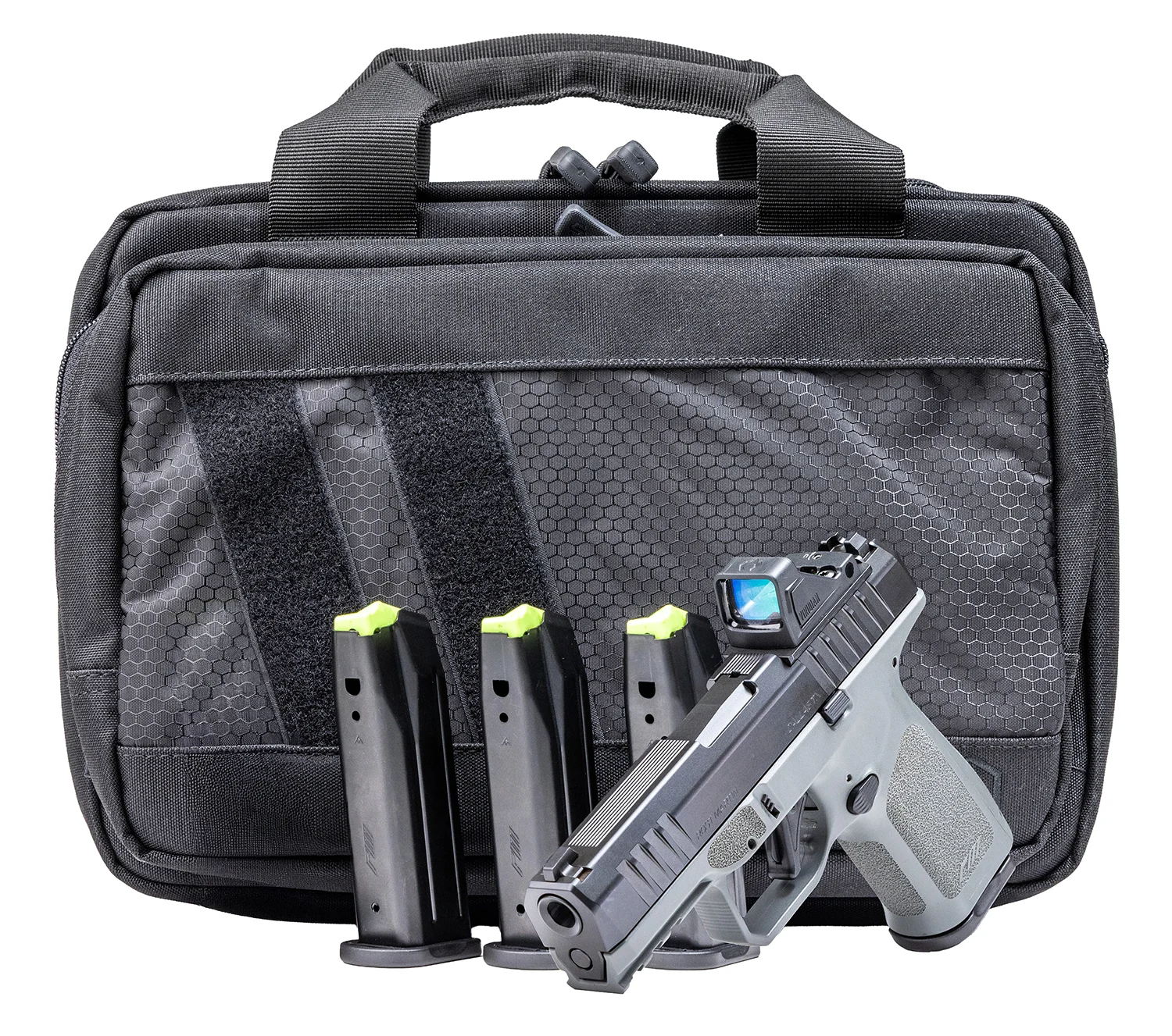 The RM1C is a precision-engineered, optic-ready, striker-fired pistol with a crowned match barrel; Responsive grip texture; flat-face trigger with an extra-short reset; slide anti-glare serrations; ambidextrous controls; funneled magazine well; deep grip serrations front and rear w/modular backstraps to fit any hand size; textured index points on both sides of the frame to aid in recoil management and driving the gun; oversize and undercut trigger guard and extended beavertail for recoil management. Includes 5 mags, Savior Specialist pistol bag and Viridian RFX11 green dot reflex sight.