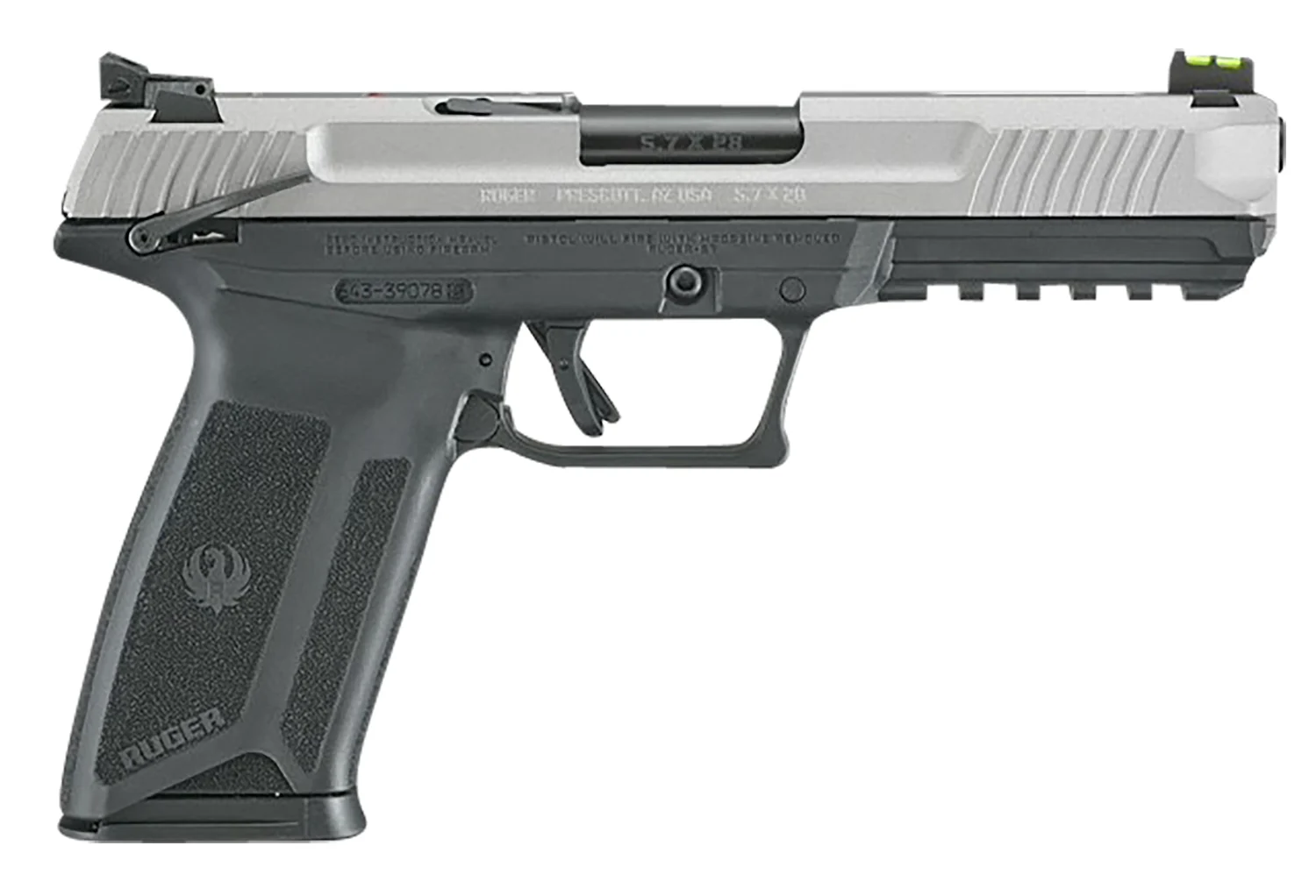 The Ruger-57 features impressive ergonomics which include an easy trigger reach, 1911-style ambidextrous manual safety, robust slide release and reversible magazine release latch. Through hardened, billet steel slide with lightening cuts is drilled and tapped for easy mounting of optics. The alloy steel barrel features a nitride treatment for wear resistance, while the textured, ergonomic frame provides a secure and comfortable grip. It utilizes Ruger’s safe, reliable and proven Secure Action fire-control system that combines a protected internal hammer with a bladed-safety trigger. The trigger has a short, smooth pull, clean break and positive reset. Safety features include: 1911-style ambidextrous manual safety; an integrated trigger safety; light-weight firing pin; neutrally balanced sear; and hammer catch. The Ruger-57 also features inspection port and Picatinny style accessory rail for easy mounting of lights and lasers.