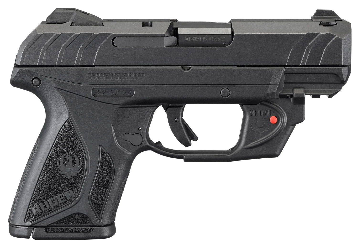 Ruger 3830 Security-9 Compact 9mm Luger 3.42″ Barrel 10+1, Black Polymer Frame With Picatinny Acc. Rail, Black Oxide Steel Slide, Manual Safety, Includes Viridian Red Laser